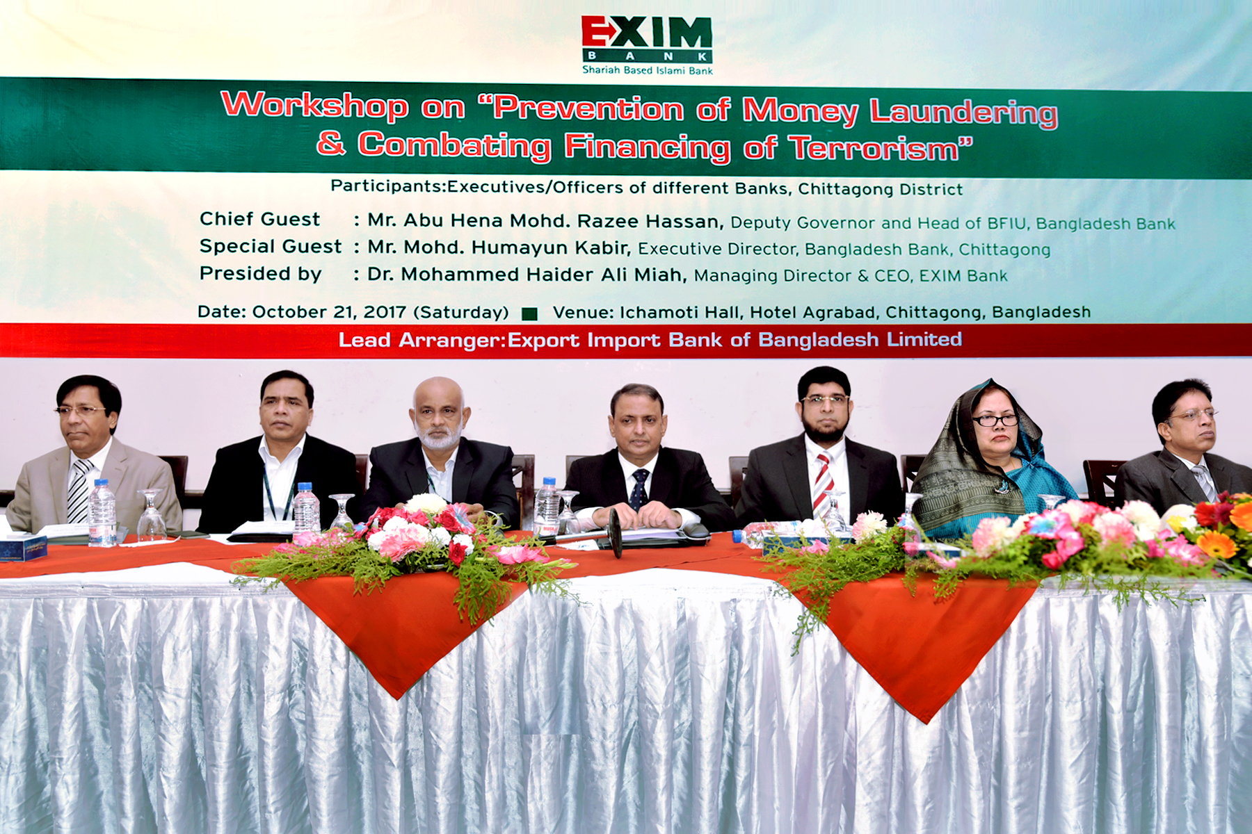 বাংলাদেশ ব্যাংকের আয়োজনে এবং এক্সিম ব্যাংকের ব্যবস্থাপনায় চট্টগ্রামের হোটেল আগ্রাবাদে আজ (২১ অক্টোবর, ২০১৭) প্রিভেনশন অব মানি লন্ডারিং এন্ড কমব্যাটিং ফিন্যান্সিং অব টেরোরিজম শীর্ষক দিনব্যাপি এক কর্মশালার আয়োজন করা হয়। অনুষ্ঠানে প্রধান অতিথি হিসেবে উপস্থিত ছিলেন বাংলাদেশ ব্যাংকের ডেপুটি গভর্নর আবু হেনা মোহাম্মদ রাজী হাসান এবং সভাপতিত্ব করেন এক্সিম ব্যাংকের ব্যবস্থাপনা পরিচালক ও প্রধান নির্বাহী ড. মোহাম্মদ হায়দার আলী মিয়া।