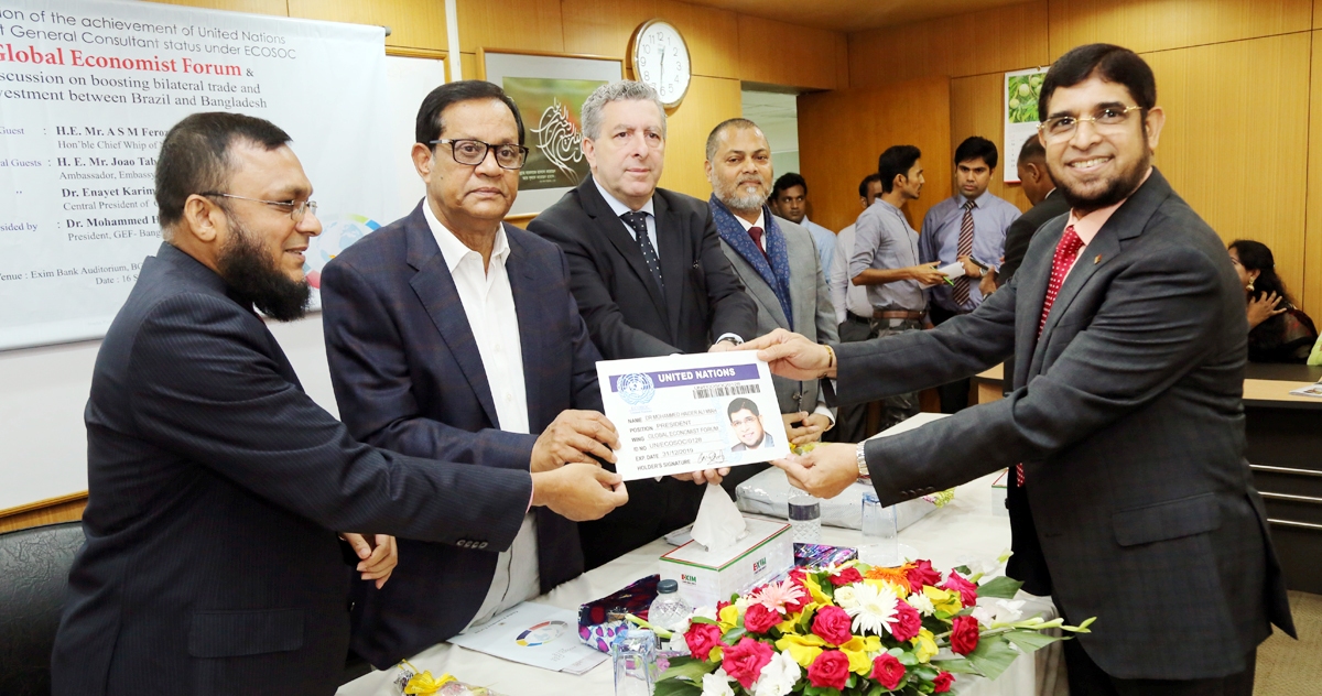আন্তর্জাতিক উন্নয়ন ও গবেষণা সংস্থা- গ্লোবাল ইকোনমিস্ট ফোরাম জাতিসংঘের অর্থনৈতিক ও সামাজিক পরিষদের স্থায়ী পরামর্শক সদস্য পদ লাভ করায় ফোরামের বাংলাদেশ চ্যাপ্টারের সভাপতি ও এক্সিম ব্যাংকের ব্যবস্থাপনা পরিচালক ড. মোহাম্মদ হায়দার আলী মিয়াকে জাতিসংঘের পক্ষ থেকে অ্যাক্রিডিটেশন কার্ড প্রদান করা হয়েছে।