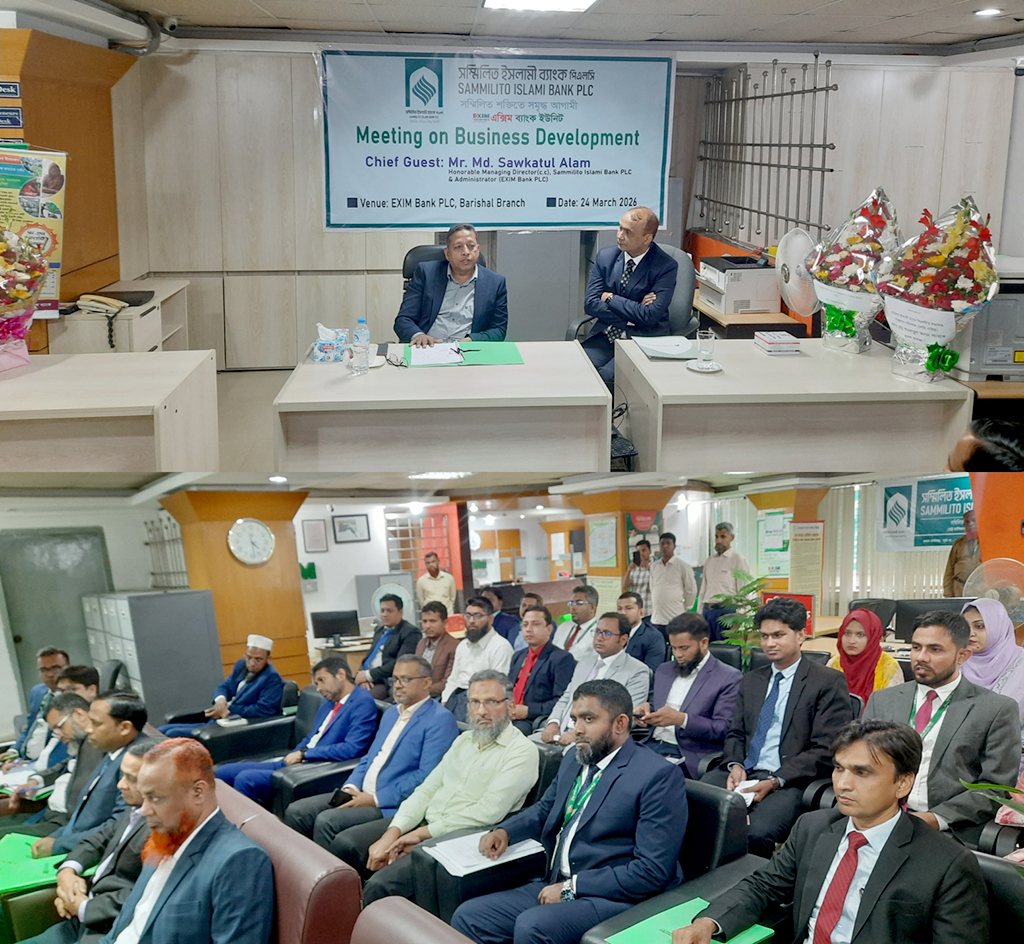 বরিশাল অঞ্চলে সম্মিলিত ইসলামী ব্যাংক পিএলসি’র আওতাধীন ব্যাংকসমূহের শাখাব্যবস্থাপকদের নিয়ে ব্যবসা উন্নয়ন সভা অনুষ্ঠিত হয়েছে। গত ২৪ মার্চ ২০২৬ তারিখে এক্সিম ব্যাংকের বরিশাল শাখায় আয়োজিত এ সভায় প্রধান অতিথি হিসেবে উপস্থিত ছিলেন সম্মিলিত ইসলামী ব্যাংকের ভারপ্রাপ্ত ব্যবস্থাপনা পরিচালক ও এক্সিম ব্যাংকের প্রশাসক মোঃ শওকাতুল আলম।